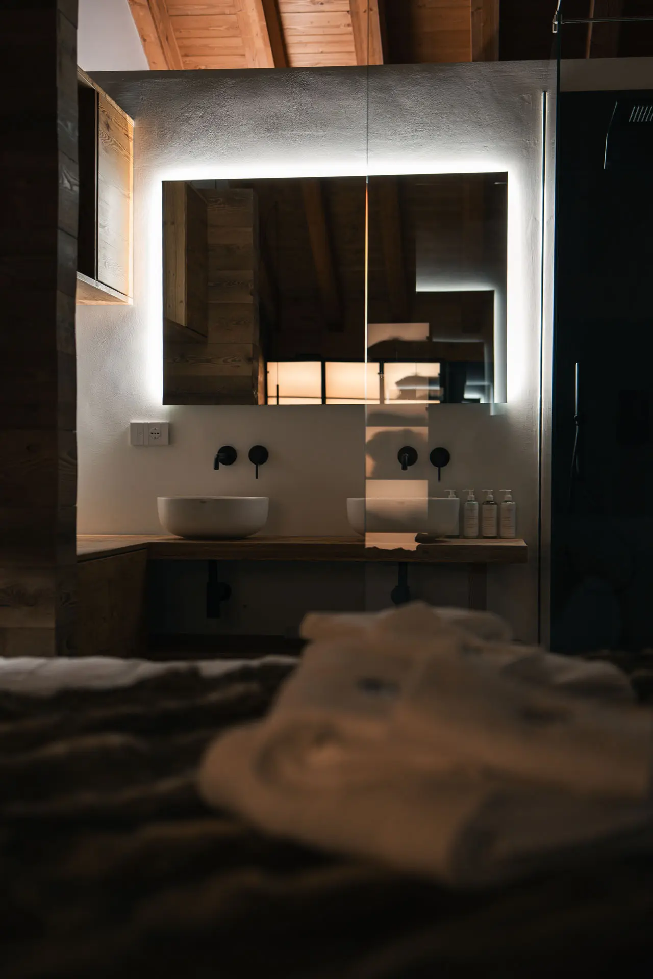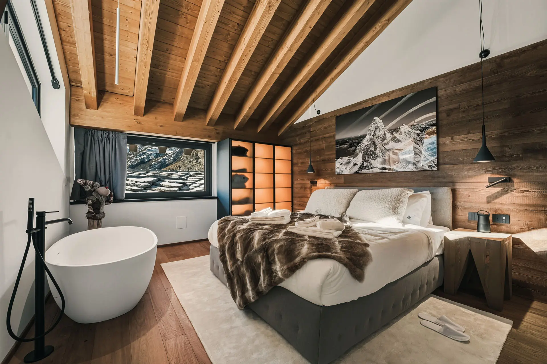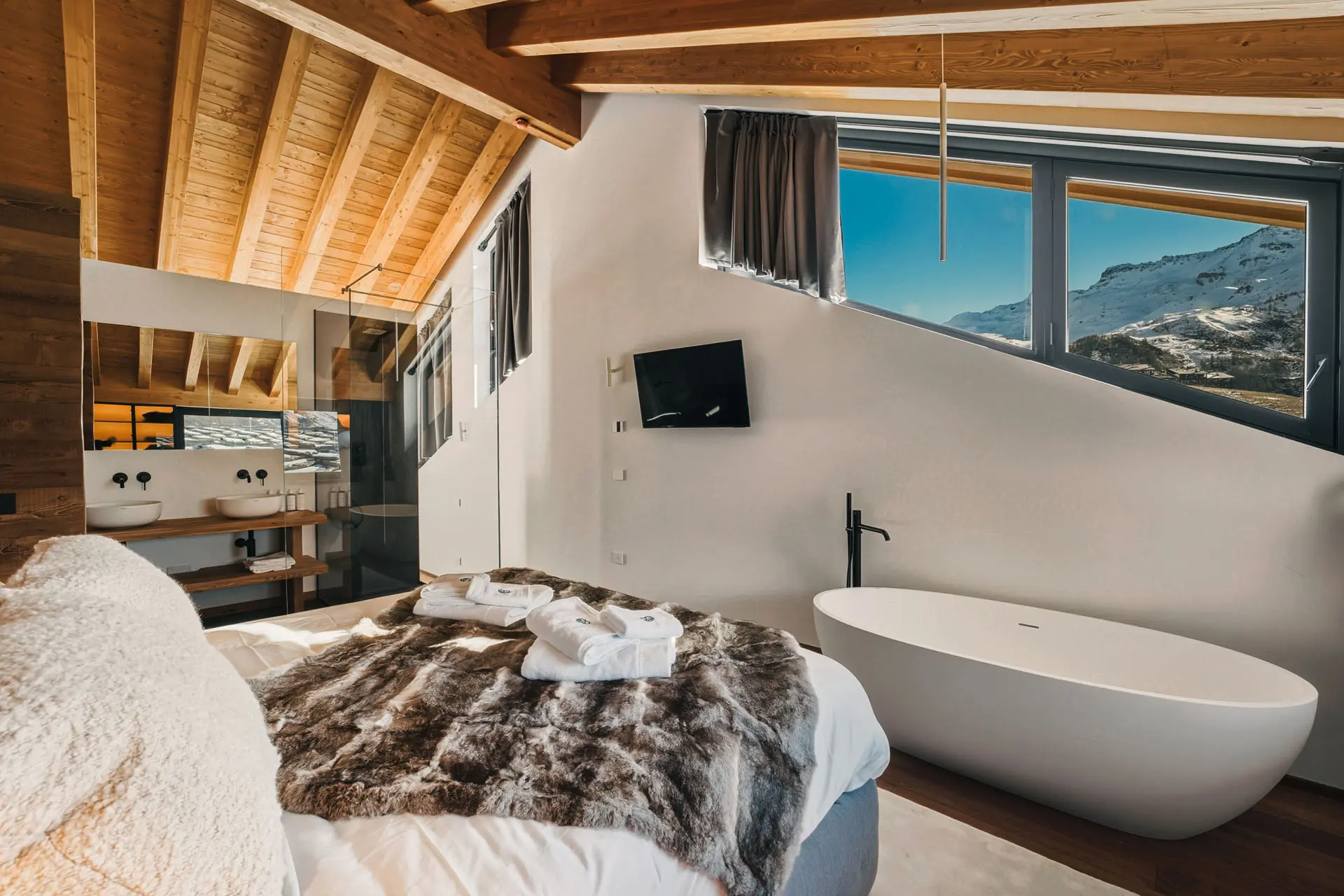 The Master Suite offers modern elegance and warm comfort. With its authentic charm, you can enjoy panoramic views of the majestic peaks of the Zermatt Cervinia domain. This suite enchants with its king-size bed, an Italian-style shower, and a bathtub facing the summit— a true gem nestled in the heart of the mountains.