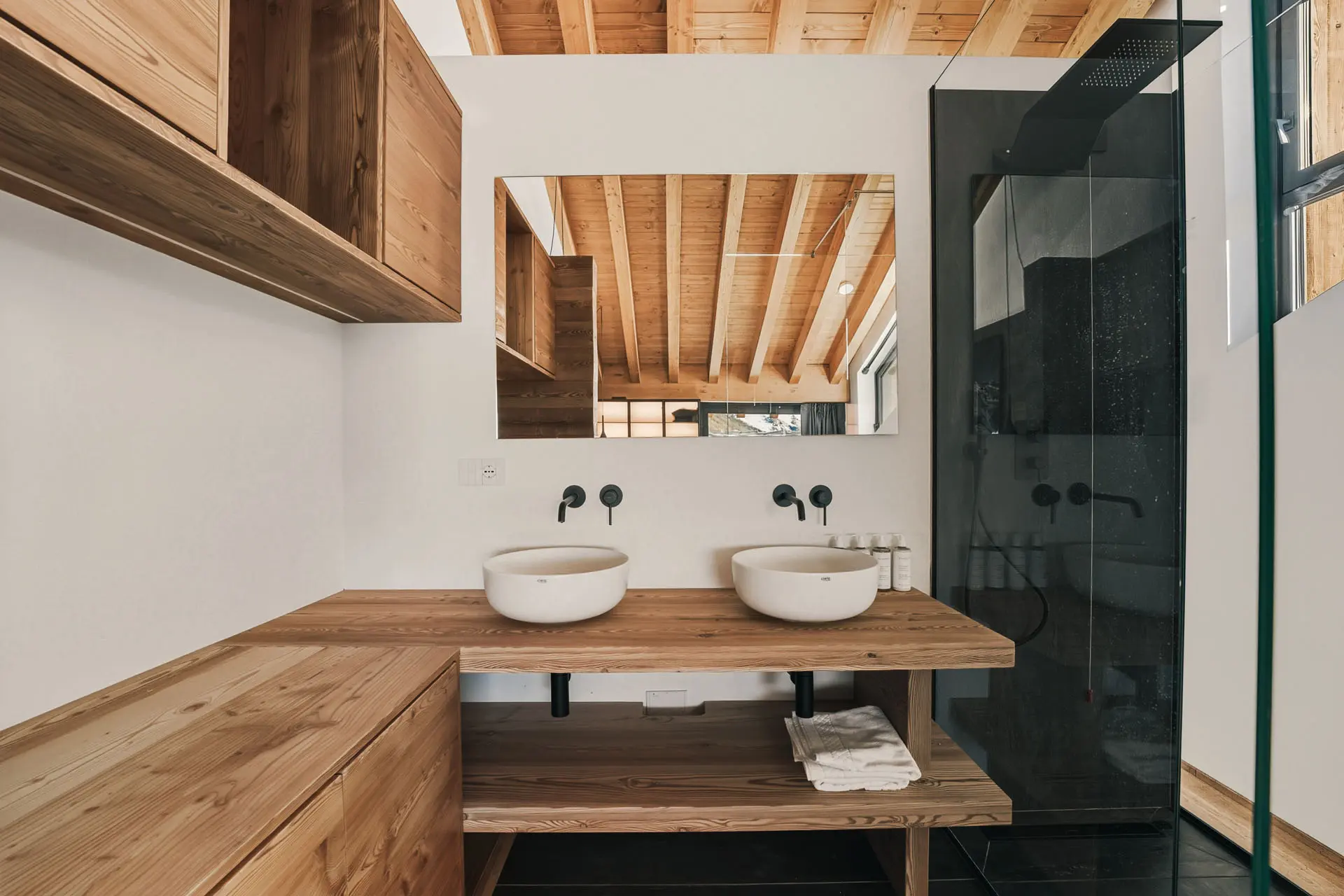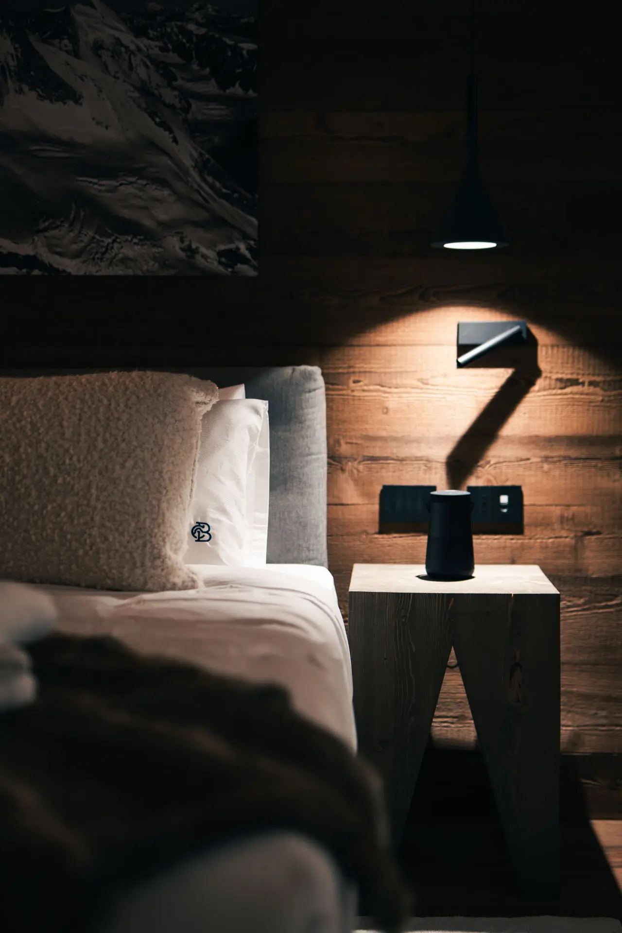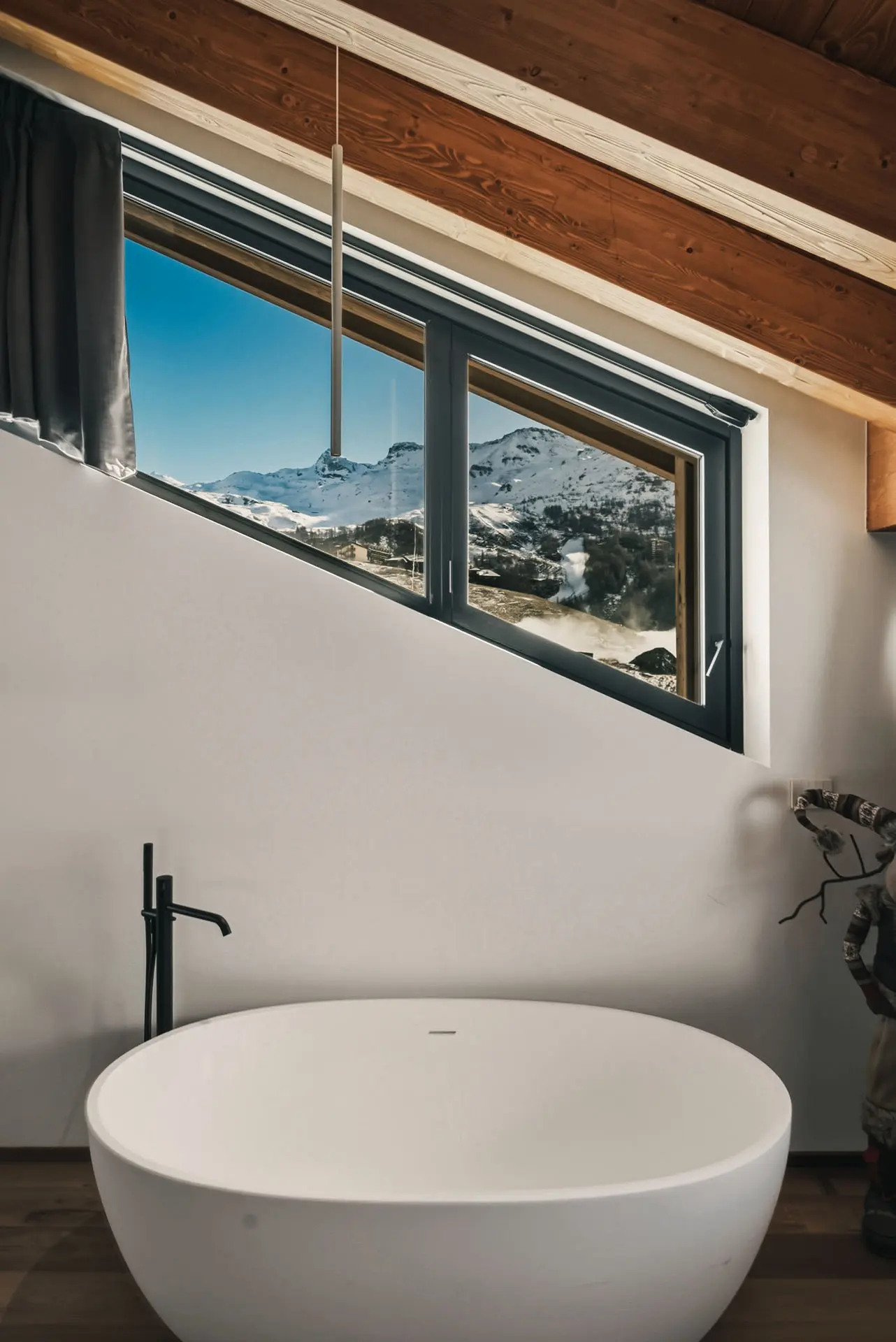 The Master Suite offers modern elegance and warm comfort. With its authentic charm, you can enjoy panoramic views of the majestic peaks of the Zermatt Cervinia domain. This suite enchants with its king-size bed, an Italian-style shower, and a bathtub facing the summit— a true gem nestled in the heart of the mountains.